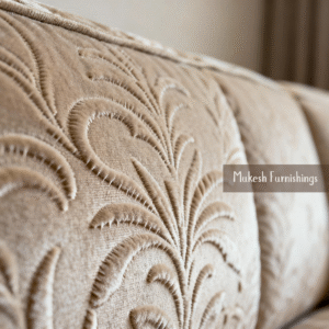 The artisans at Mukesh Furnishings take special care in crafting each embossed design, ensuring every pattern is sharp, symmetrical, and durable. It’s the perfect choice for statement sofas, accent chairs, or even luxurious hotel interiors. Raising Emboss is not just about visual appeal – it’s about feeling that quiet touch of sophistication every time you sit down.